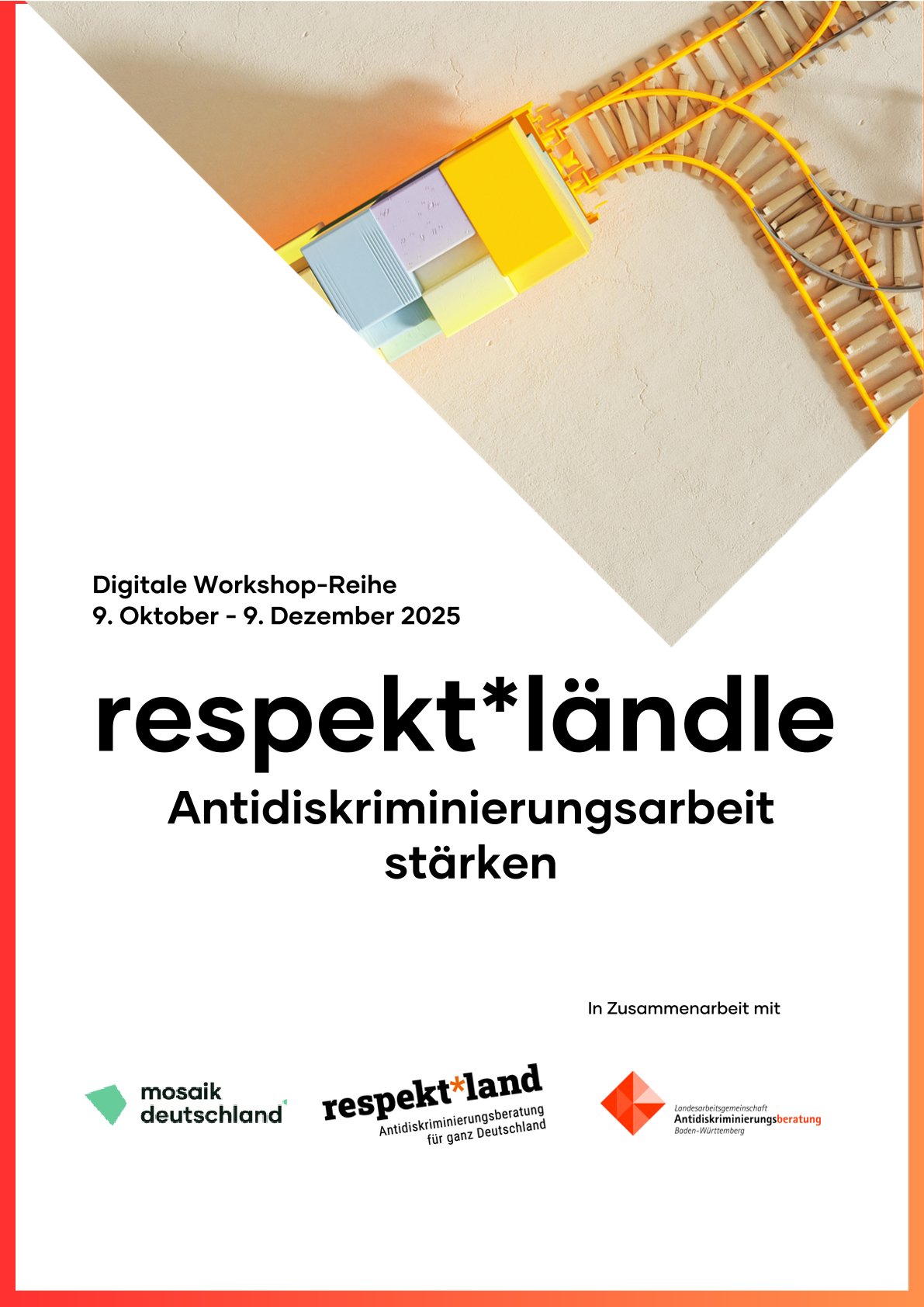 Jakob2025-10-09T07:56:52+00:00Wir freuen uns, Sie zur digitalen Workshop-Reihe „respekt*ländle – Antidiskriminierungsarbeit stärken!“ einzuladen, die im Zeitraum vom 09. Oktober bis 09. Dezember 2025 stattfindet. Die Reihe ist Teil des Projekts respekt*land, das von der Antidiskriminierungsstelle des Bundes und dem Ministerium für Soziales, Gesundheit und Integration Baden-Württemberg gefördert wird und von den neun lokalen Antidiskriminierungsbüros umgesetzt [...]